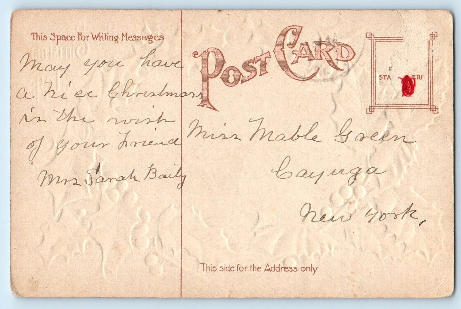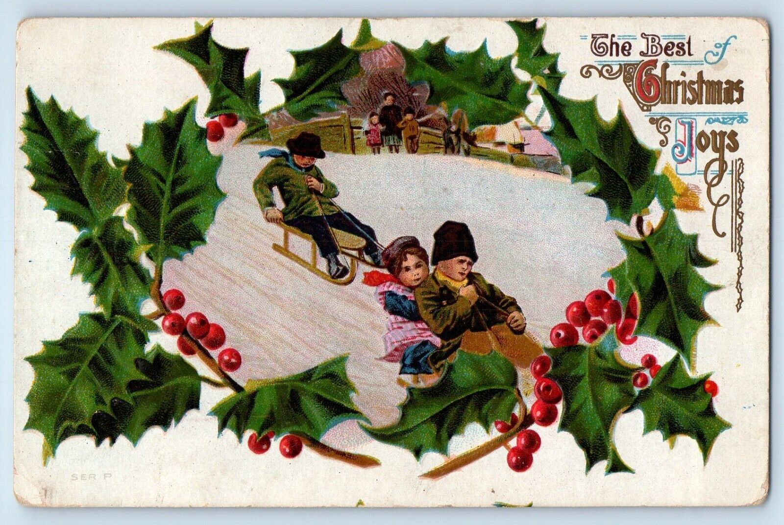 Christmas Postcard Childrens Sledding Holly Berries Winter Scene Embossed c1910s