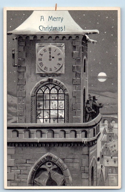 Christmas Postcard Clock Tower Men With Trumpet Snow Winter Scene c1910's