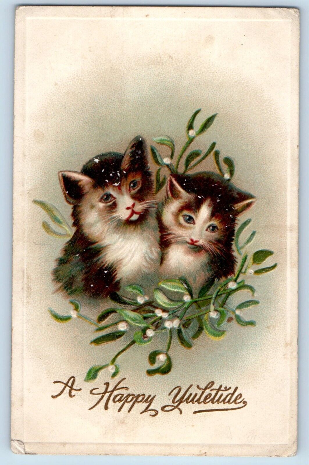 Christmas Postcard Cute Cat Kittens Mistletoe Clapsaddle Embossed c1910's