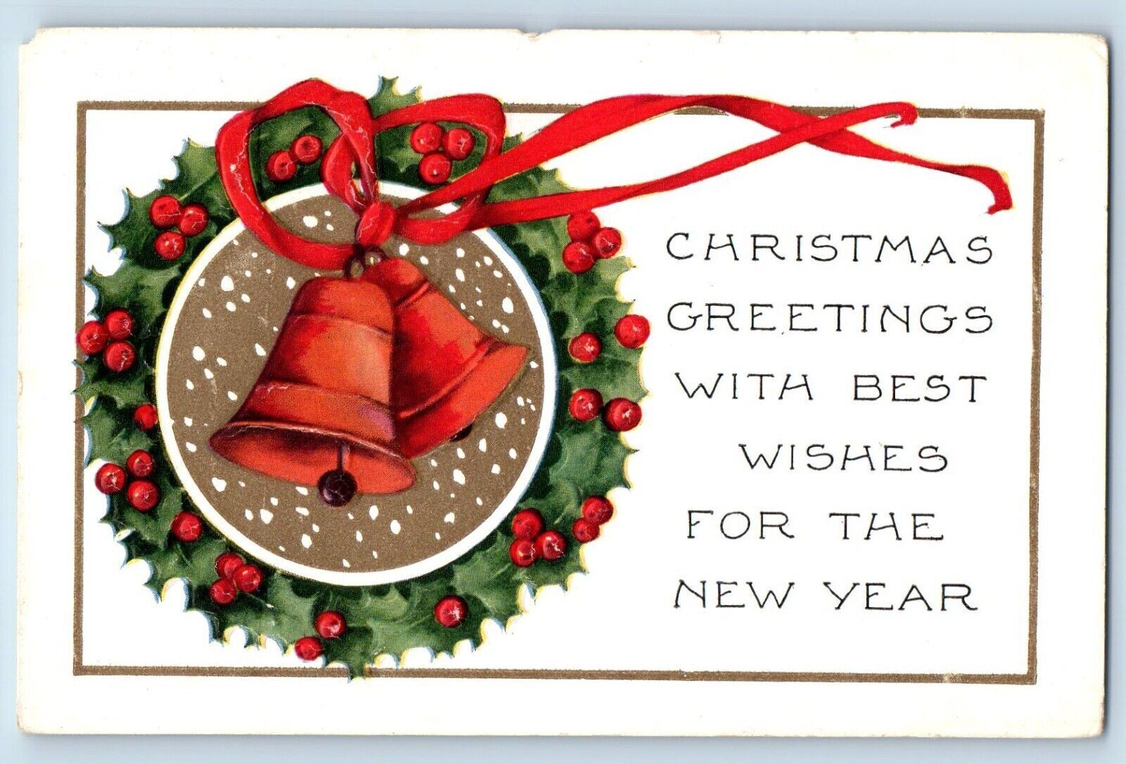 Christmas Postcard Greetings Holly Berries Wreath Ringing Bells Embossed c1910's