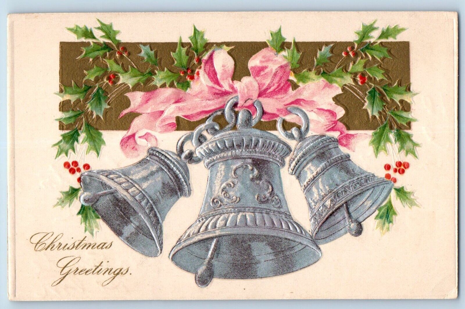 Christmas Postcard Greetings Ringing Bells Holly Berries Nash Embossed c1905