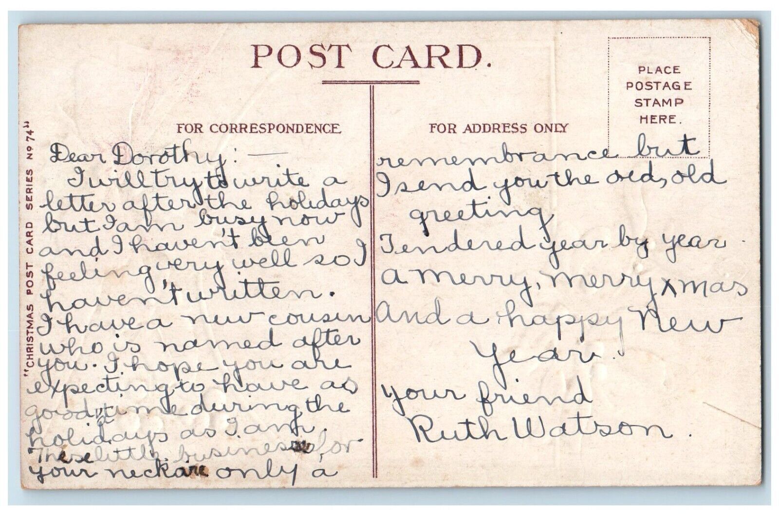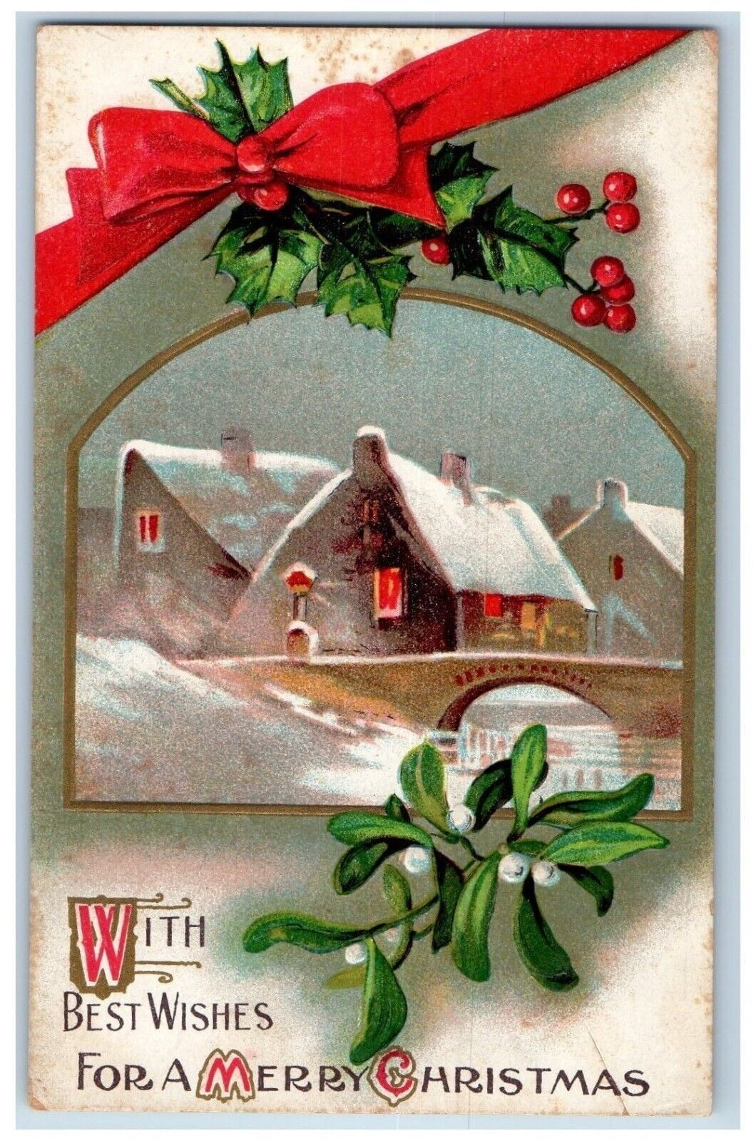 Christmas Postcard Holly Berries Mistletoe Winter Scene Embossed c1910's Antique