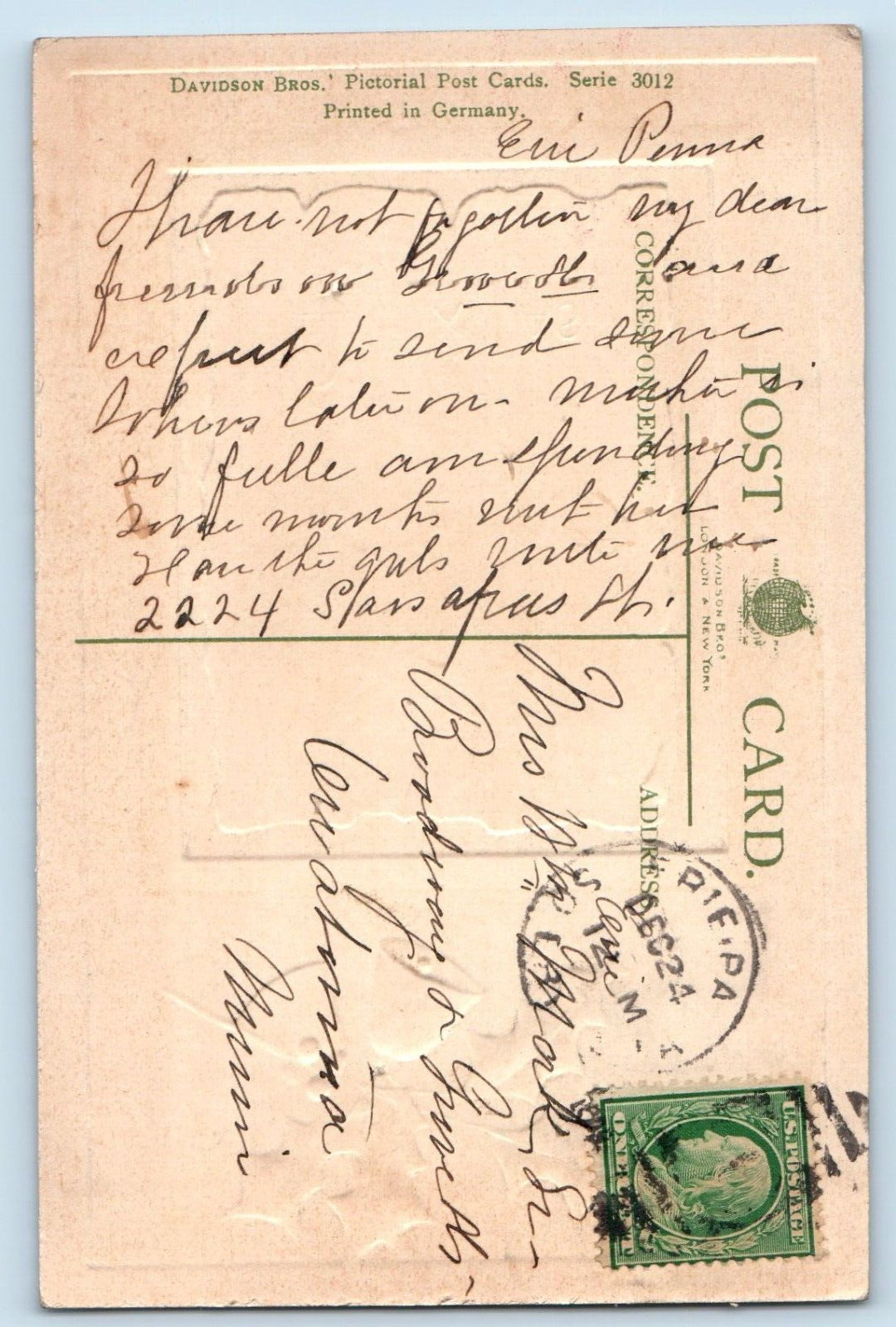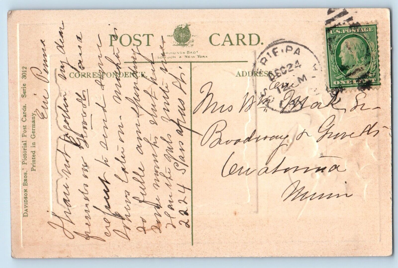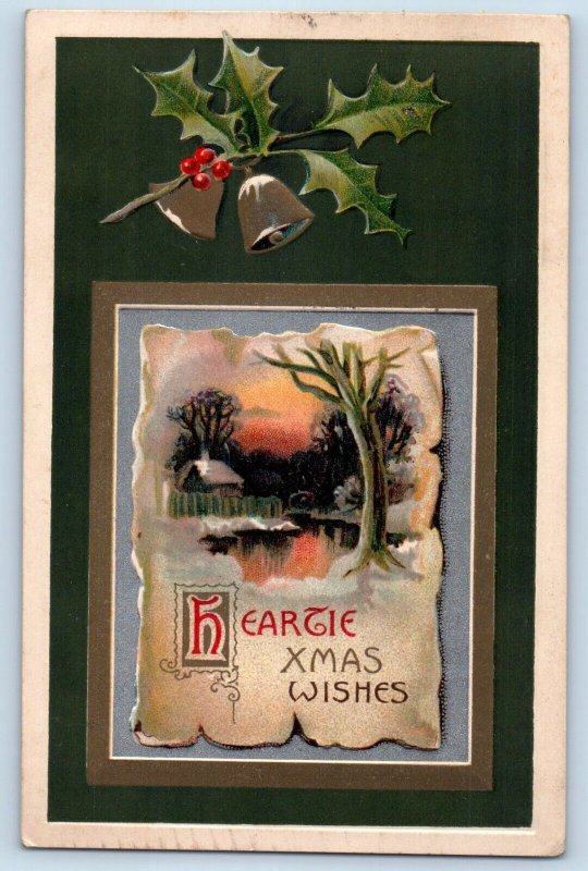 Christmas Postcard House Winter Scene Bell Berries Embossed c1910's Antique