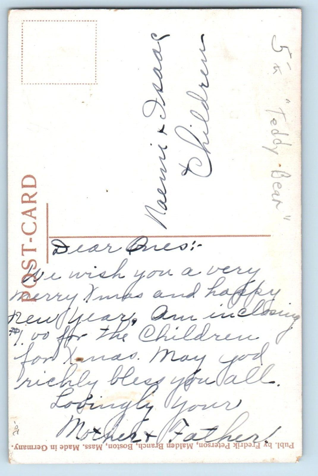Christmas Postcard Mother Seeing Children Sleeping Teddy Bear c1910's Antique