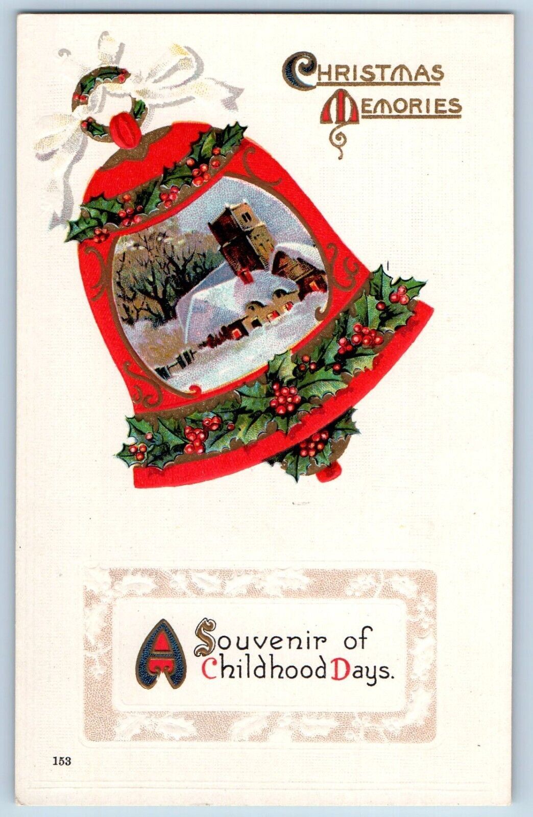Christmas Postcard Ringing Bell With Holly Berries House Winter Embossed c1910's