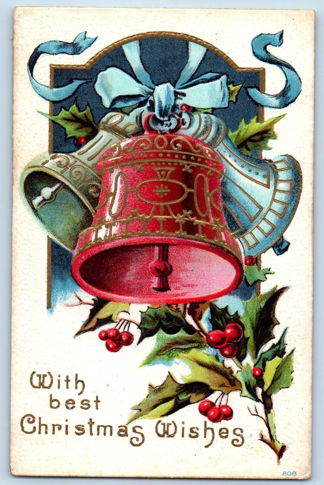Christmas Postcard Ringing Bells And Holly Berries Embossed c1910's Antique