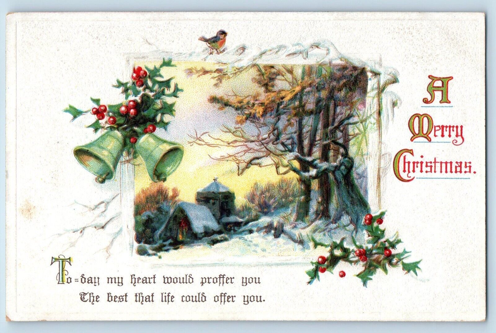 Christmas Postcard Ringing Bells Holly Berries Winter Scene Embossed c1910's