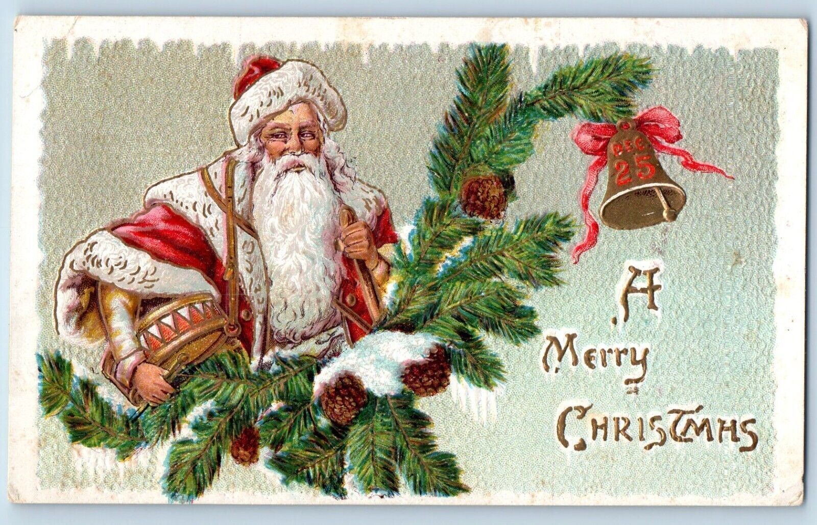 Christmas Postcard Santa Claus Pine Cone Ringing Bell Old World Embossed c1910's