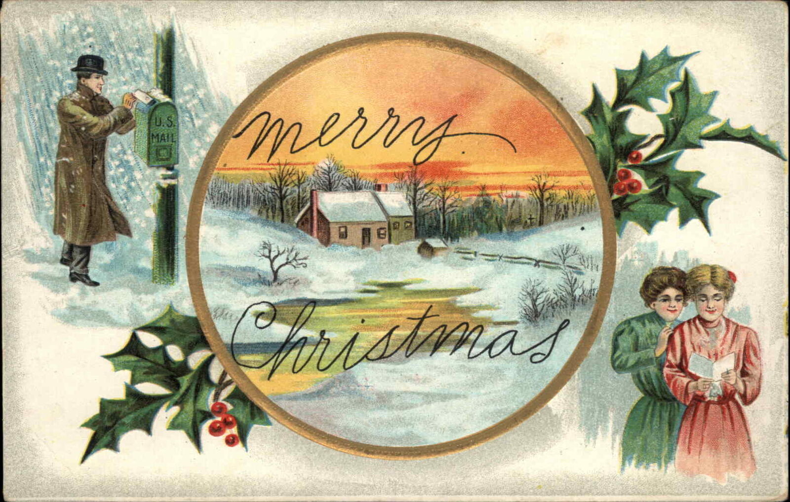 Christmas Romance Man Mailing Letter Pretty Lady Reading c1910 Postcard