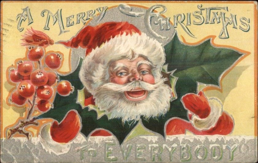Christmas - Santa Claus Face Thru Holly Leaf c1910 Postcard