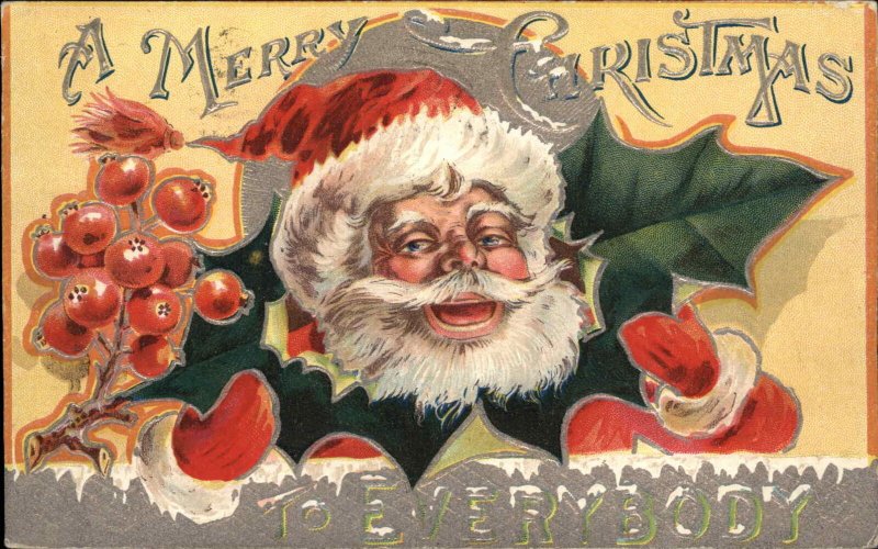 CHRISTMAS Santa Claus w Holly Berry Border EMBOSSED c1910 Postcard