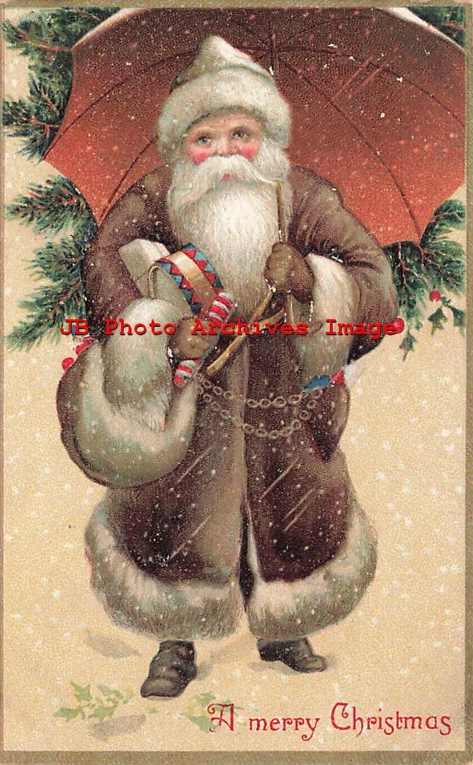 Christmas, Unknown No 254, Brown Robe Santa with Umbrella Product Photo Click Image for Larger Preview Product Information This is a nice vintage early chromolithograph printed and embossed Christmas postcard. Publi ... Read More