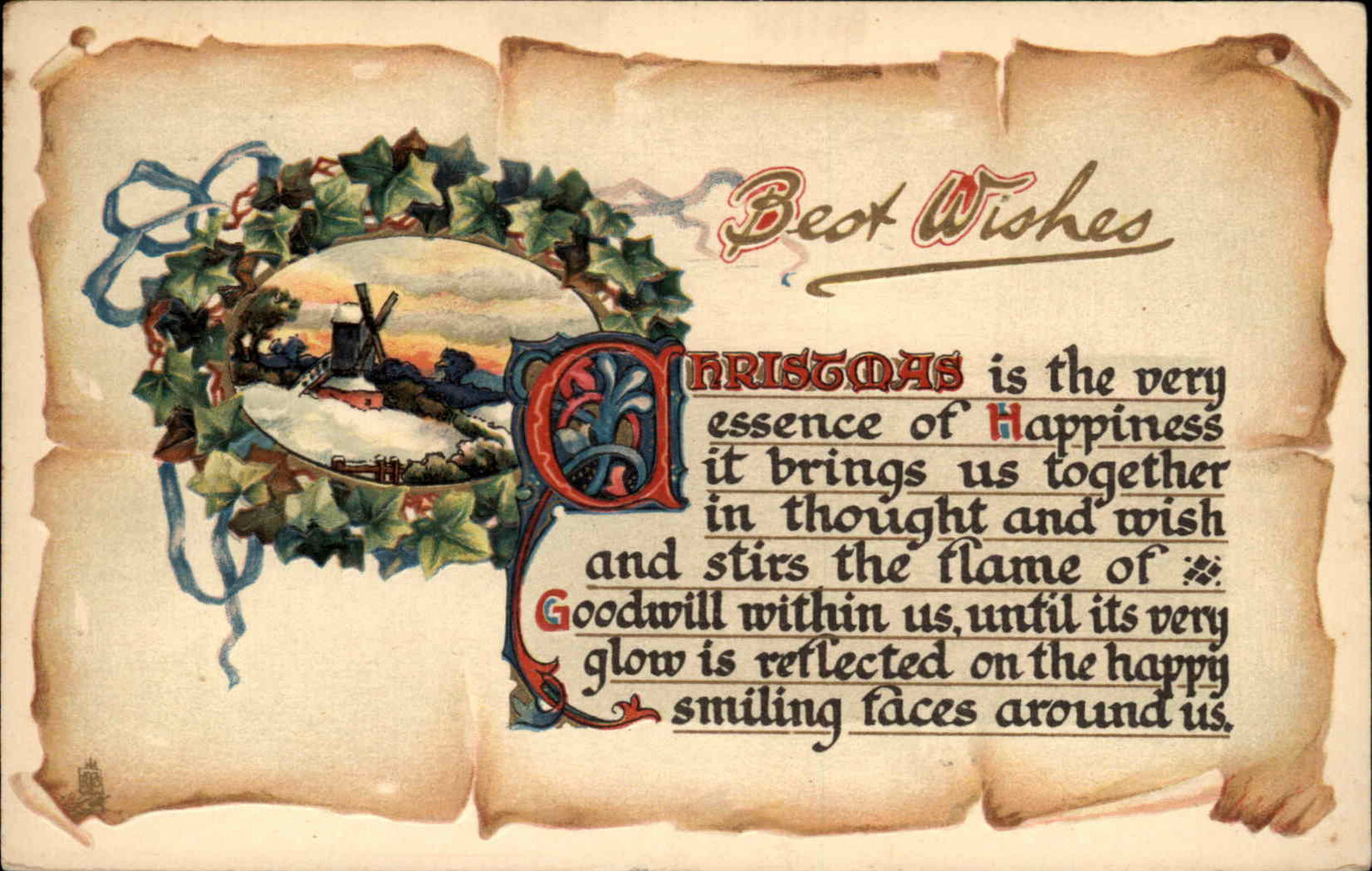Christmas Windmill Scroll c1900s-20s Postcard
