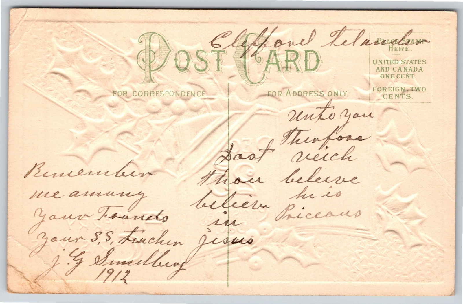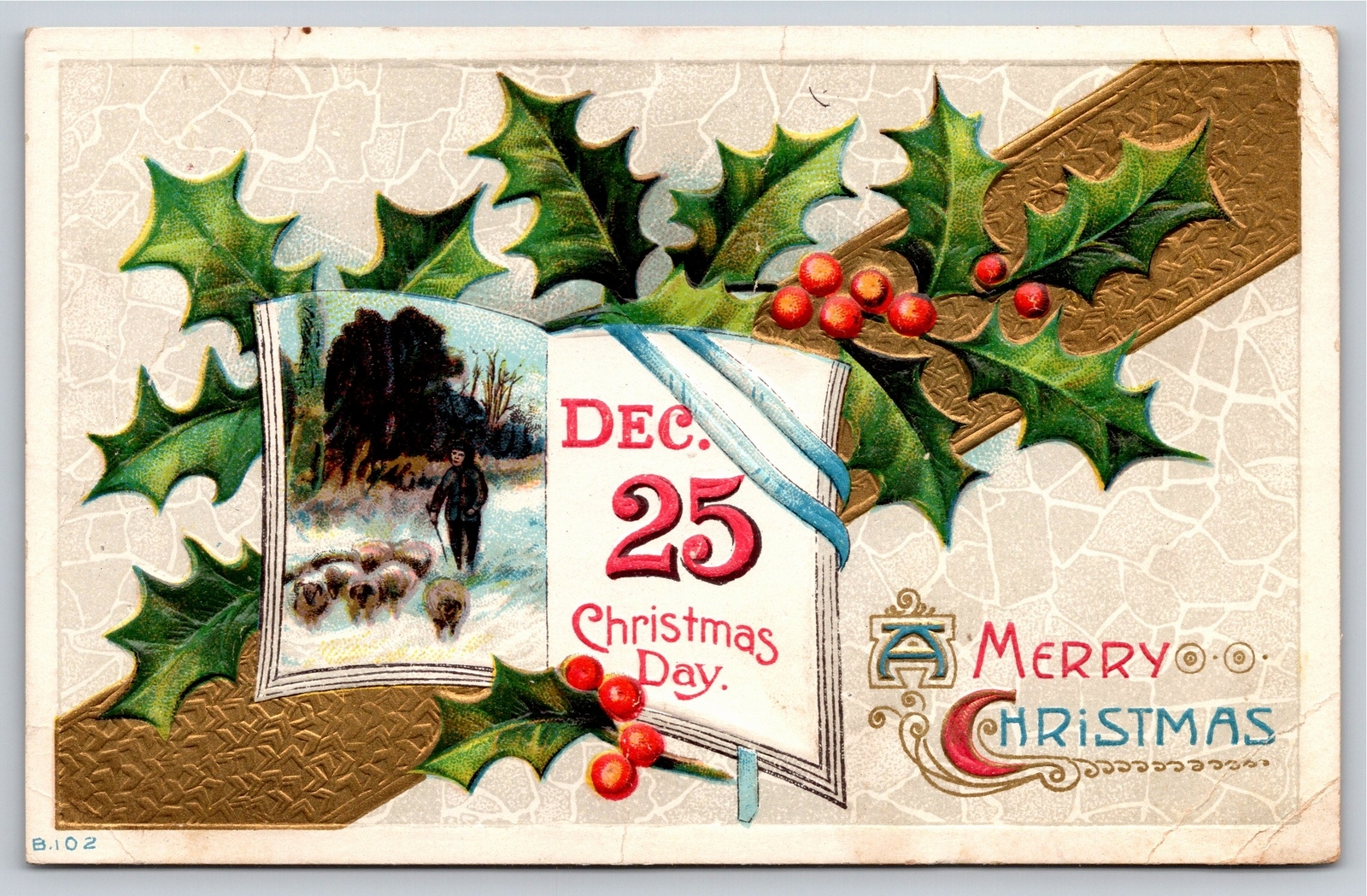 Christmas~Holly Sheep On Book & Greeting~Vintage Postcard