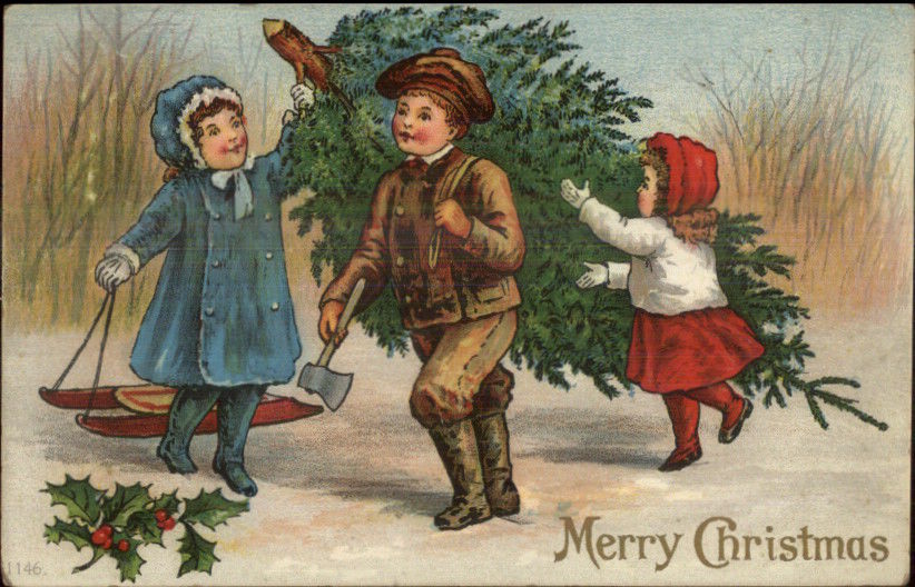 Chriustmas #1146 Children Bring Home the Tree c1910 Postcard