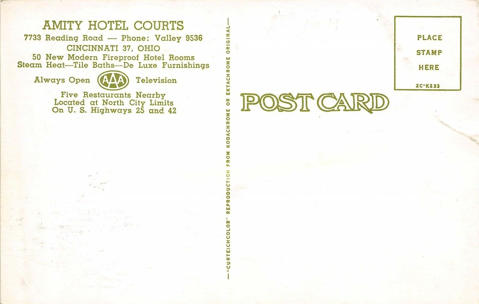 Cincinnati Ohio 1950s Postcard Amity Hotel Courts