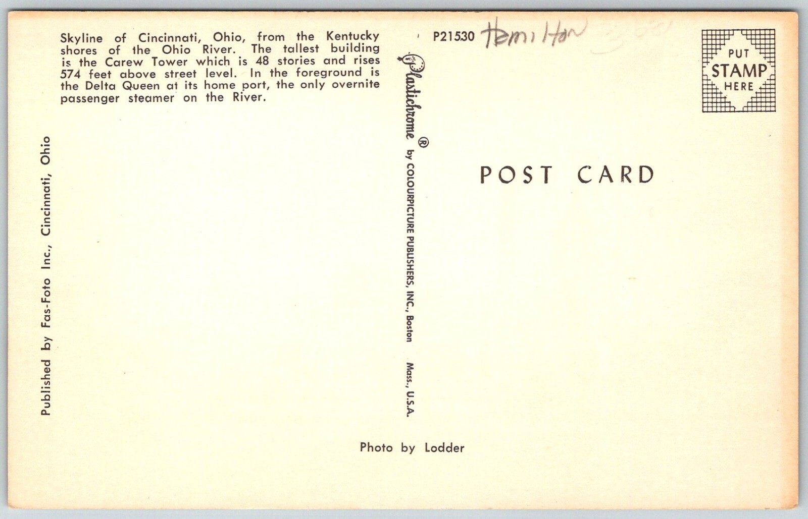 Cincinnati Ohio 1950s Postcard Skyline From Kentucky Delta Queen