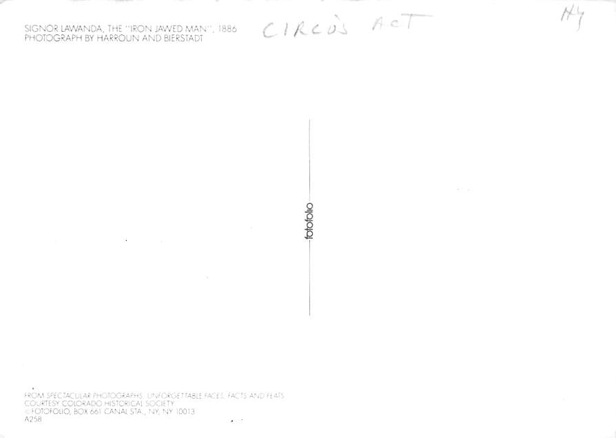 Circus - Iron Jawed Man 1 Grading Scale: Grade 1 = Perfect corners Grade 2 = Very Minimal corner wear, no creases Grade 3 = Some corner wear, no creases. Grade 4 = Crease Grade 5 = A lot of damage to card. * Grade ... Read More