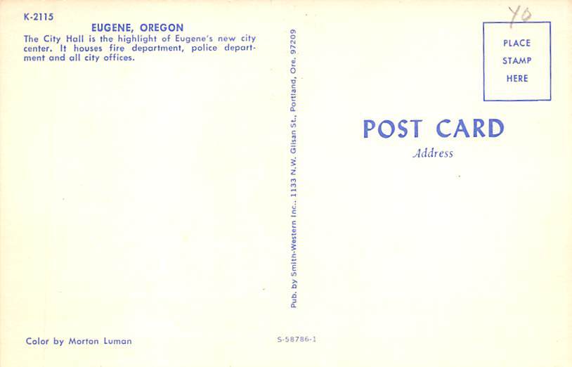 City Hall Eugene, Oregon OR Postcard - Unused Grade: 1 Size: R - Regular Size Postcard - approximately 3 1/2 inch x 5 1/2 inch (9 CM x 14 CM) Grading Scale: Grade 1 = Perfect corners Grade 2 = Very Minimal corn ... Read More