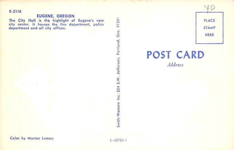 City Hall Eugene, Oregon OR Postcard - Unused Grade: 1 Size: R - Regular Size Postcard - approximately 3 1/2 inch x 5 1/2 inch (9 CM x 14 CM) Grading Scale: Grade 1 = Perfect corners Grade 2 = Very Minimal corn ... Read More