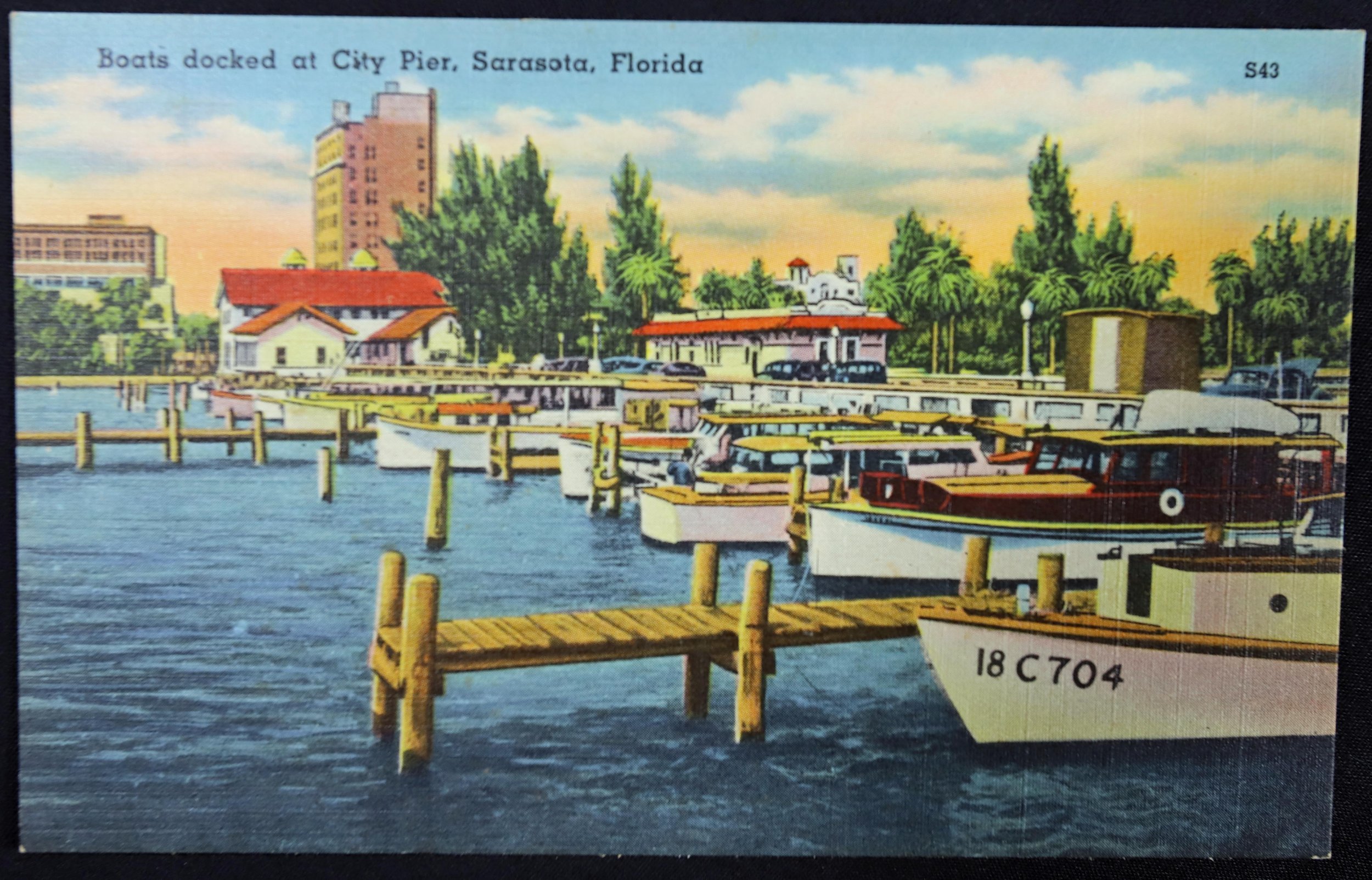 Boats docked at City Pier, Sarasota Florida. Tichnor Bros. Boston Mass.