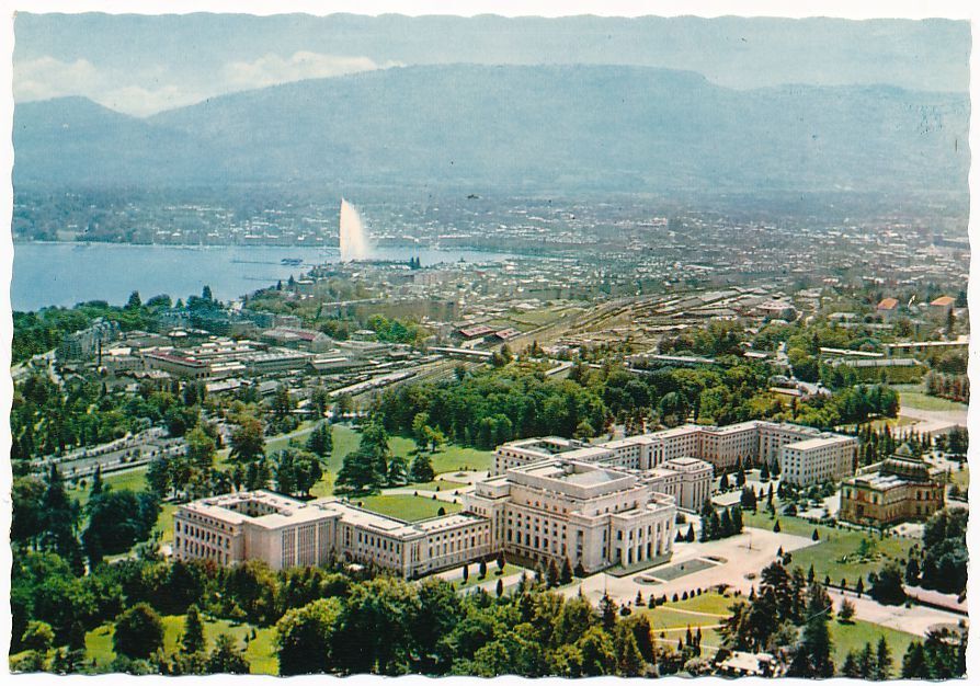 City View and Palace of Nations. Geneva, Switzerland. Continental sized chrome card. Addressed but not mailed. Very good condition.