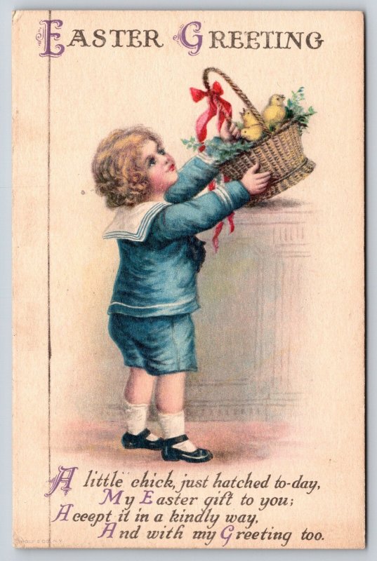 Clapsaddle Easter~Sailor Boy Lifts Newly Hatched Chicks in Wicker Basket~WOLF