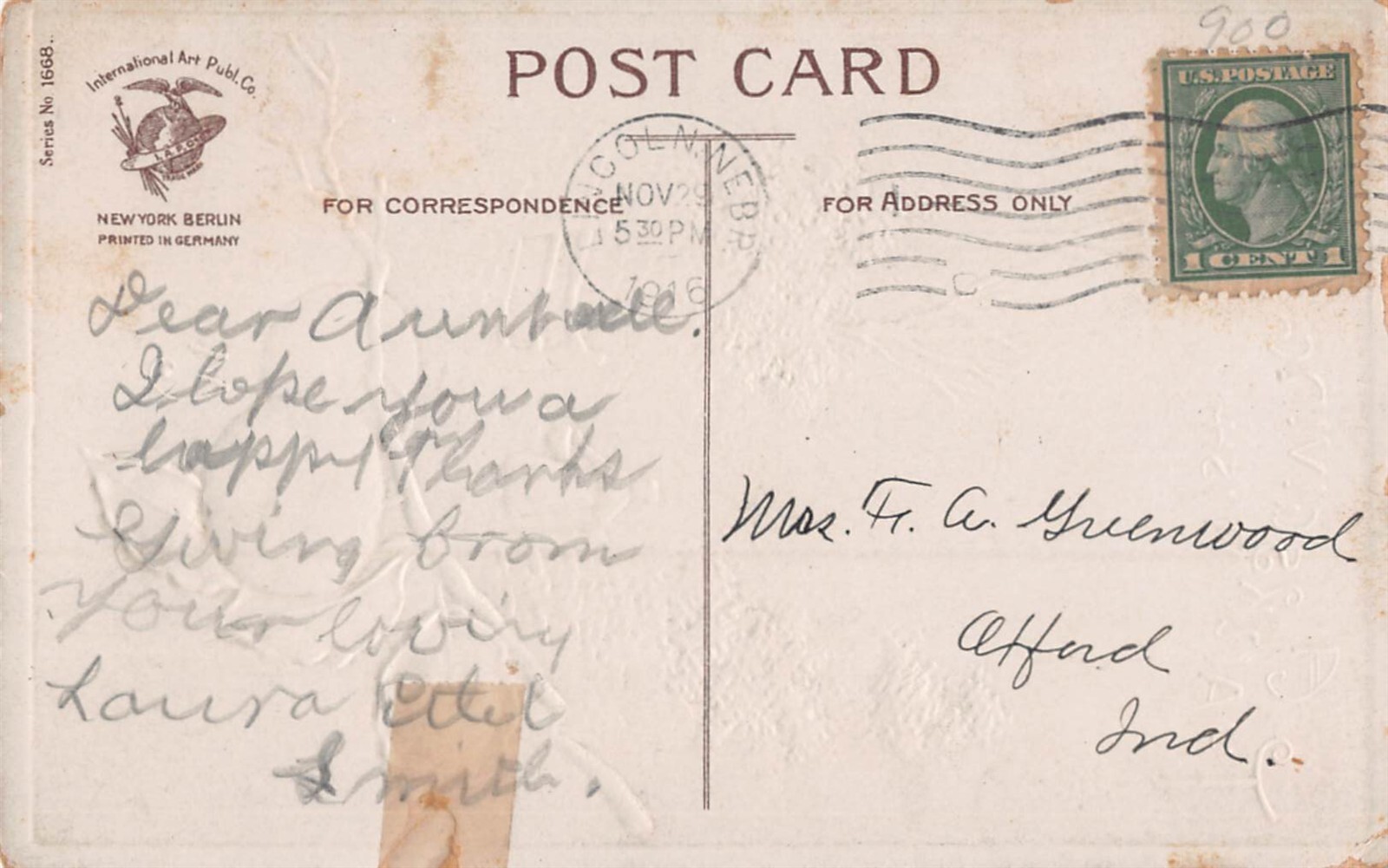 Clapsaddle Thanksgiving sunset postcard clap02 series 63 ,B,C D,,FAll items are ORIGINAL, not reprints, .Please look at scans for postcard condition, my ideas might be different than yours Excellent - showing very little sign of wear , small corner bumpsVery good – may have worn corners or a small creaseGood—noticeable creases and or bad cornerFair -- very well worn scans will show any flaws with the backs showing any small defects.Questions always welcome All cards are send in a stiff envelope if you want more protection please let me know for a 2.00 upgrade.Due to easy digital reproduction, I can only offer a refund if item is significantly different from description. Powered by SixBit's eCommerce Solution