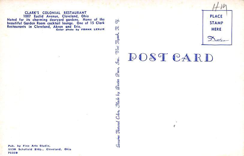 Clark's Colonial Restaurant Cleveland, Ohio OH Postal Date: View back of card Grade: 2 Size: Regular Size Postcard - approximately 3 1/2 inch x 5 1/2 inch (9 CM x 14 CM) Grading Scale: Grade 1 = Perfect corne ... Read More