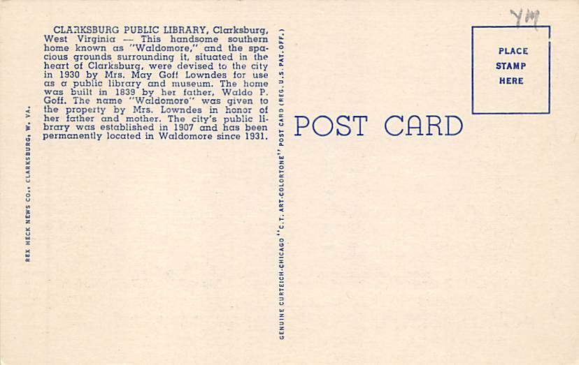 Clarksburg Public Library, Clarksburg, West Virginia WV Postcard - Unused