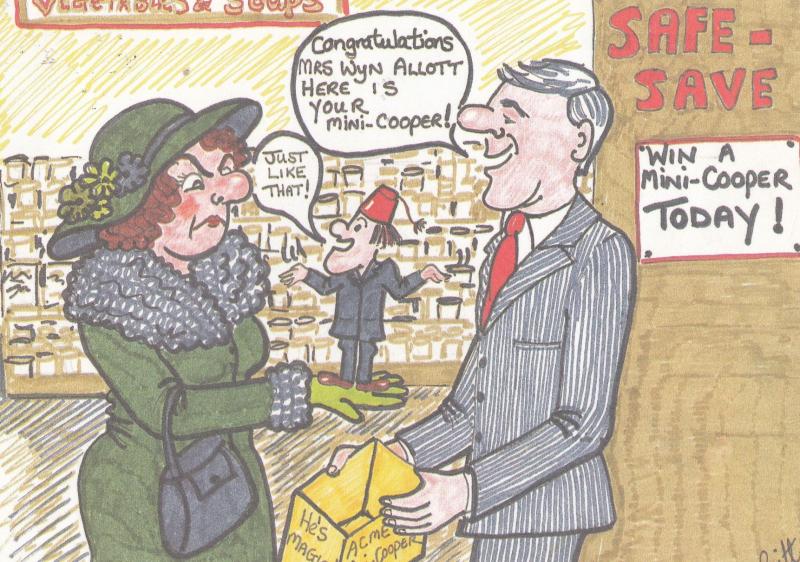news64 A fascinating 1970s competitors club postcard of comic humour of a lady winning a Mini Cooper car finding out its not the mini she thought it would be used but mint condition