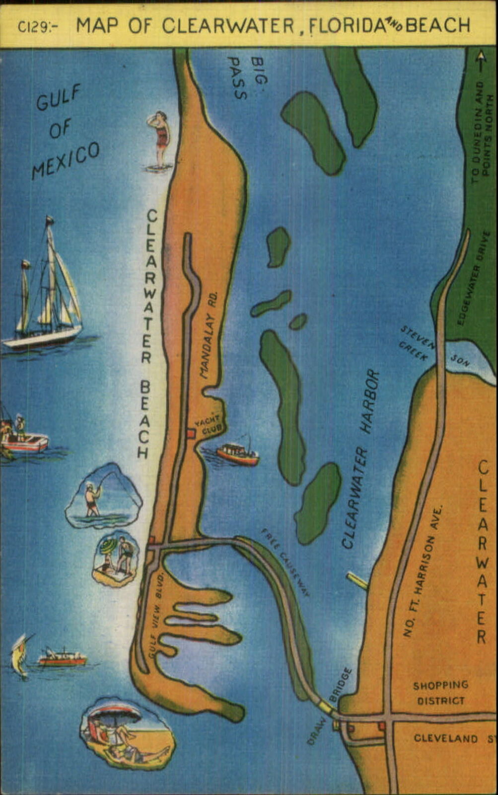 Clearwater FL Linen Map Postcard