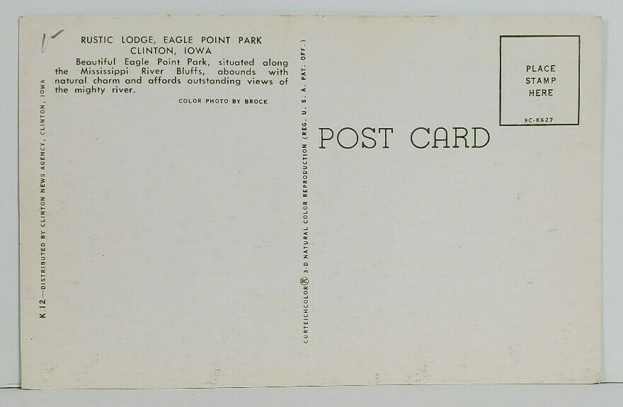 Clinton Iowa, Rustic Lodge Eagle Point Park Postcard N8