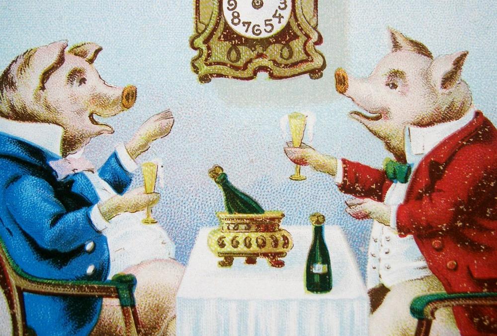 Clock New Year Dressed Pigs Toast w/ Champagne Postcard