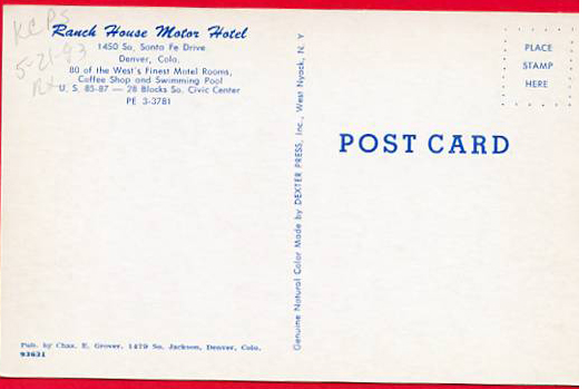 CO- Denver. Ranch House Motor Hotel E, Un, Db, C Grading of Postcards MINT (M): Perfect condition, no apparent blemishes, flaws, postally unused, may have some writing on back. NEAR MINT (NM): Like new, image is u ... Read More