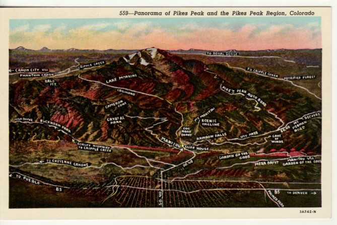 CO SPRINGS PIKES PEAK PANORAMA MAP postcard