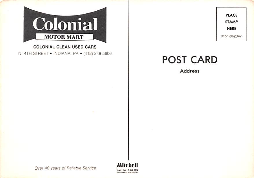 Colinial Motor Mart - Indian, Pennsylvania Grade: 1 Category: Continental Size Postcard, Approx 4 in x 6 in (10 cm x 15.25 cm) Product Size: Continental size: 4X6 inches (10.5 cm x 15 cm) Grading Scale: Grade ... Read More