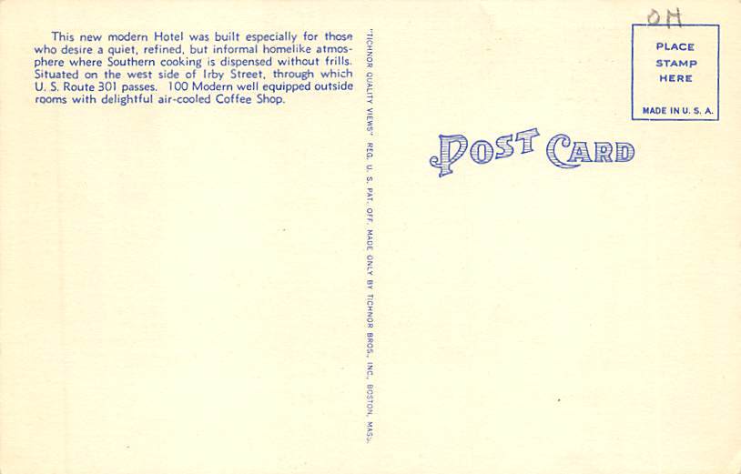 Colonial Hotel Florence, South Carolina Postcard - Unused Grade: 2 Size: R - Regular size: Approx 3 1/2 X 5 1/2 inch (9 cm X 14 cm) Grading Scale: Grade 1 = Perfect corners Grade 2 = Very Minimal corner wear, ... Read More
