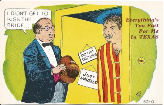 Place/Subject/Quote: From Front "Everything's Too Fast For Me in Texas" in bubble "I didn't get to kiss the bride"