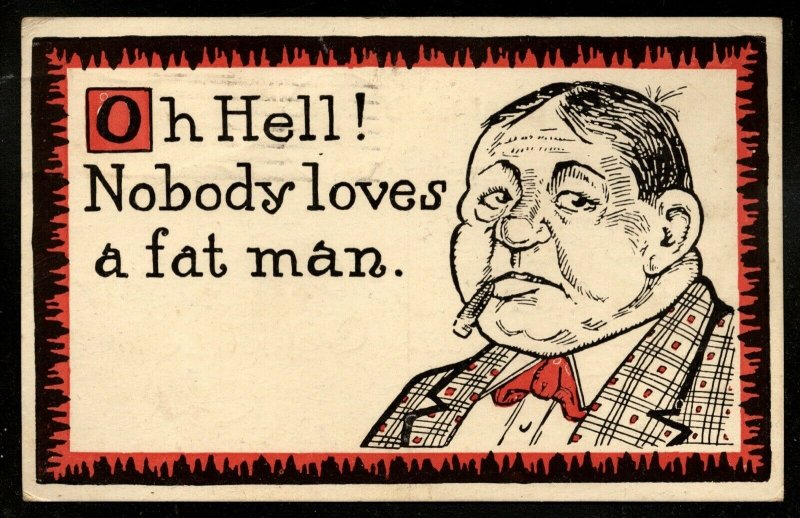 COMIC Postcard "Nobody loves a fat man" .. BEFORE BIDDING, PLEASE READ THROUGH AND MAKE SURE YOU ABIDE BY OUR CONDITIONS. Our standard shipping charges do not apply to China, Russia, Eastern Europe, Asia, Latin America and Africa. Ask for charges before bidding or ordering. Please do not leave a negative or neutral feedback. If you are not happy with your transacation, please write to us first and we will do everything we can to resolve the issue. All US items with the exception of Full Sheets, are priced with FREE shipping within the United States. For domestic shipping on Full Sheets, there will be a shipping charge of $2.50 for the FIRST sheet and ANY and ALL additional sheets ordered for shipment at same time will be subject to FREE shipping. Shipping charges Internationally will be $7.00 for the first sheet and Free shipping on all. When ordering more than one sheet, disregard the automatic invoice generated and sent by Hip and wait for our final invoice reflecting correct shipping charges. All stamps offered in my Hip Store or Hip Auction have been carefully selected for their freshness and superior overall quality. All stamps are WITHOUT faults or defects unless noted otherwise. All items are unconditionally guaranteed to be as described and a full refund will be made for items incorrectly described. Payment and Shipping Info Payment Options Payments from North America must be received no later than 10 days after the auction. Payments from international customers must be received within 14 days of end of auction. Shipping Sales Tax Please note that there is an 8.75% sales tax for California Buyers Only (or what ever the current tax is at time of order) Buy With Confidence, Checkout Our Feedbacks Payment PLEASE NOTE: If you are buying COINS or LARGER LOTS please see Hip listing above photo for Shipping Cost. If you have any questions, please email. Also, we can combine lots to save on shipping. Thank you. _gsrx_vers_827 (GS 7.0.13 (827))