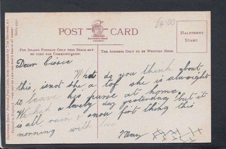 Postcard showing a Comic Style - Train / Money / Purse Mo's Postcards offers for sale a postcard showing a Comic Style - Train / Money / Purse. Artist Tom Browne. Standard size postcard. Published by Davidson Bros. ... Read More