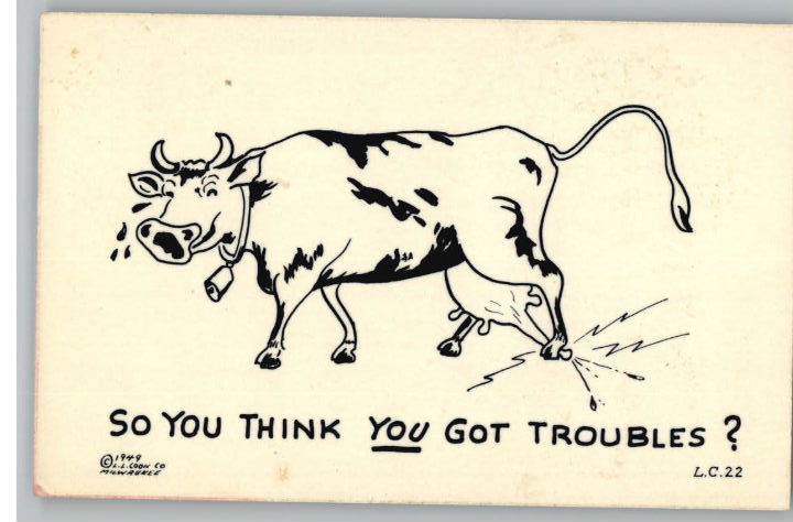 Comic Postcard..You Got Troubles? Cow Stepping on Udder