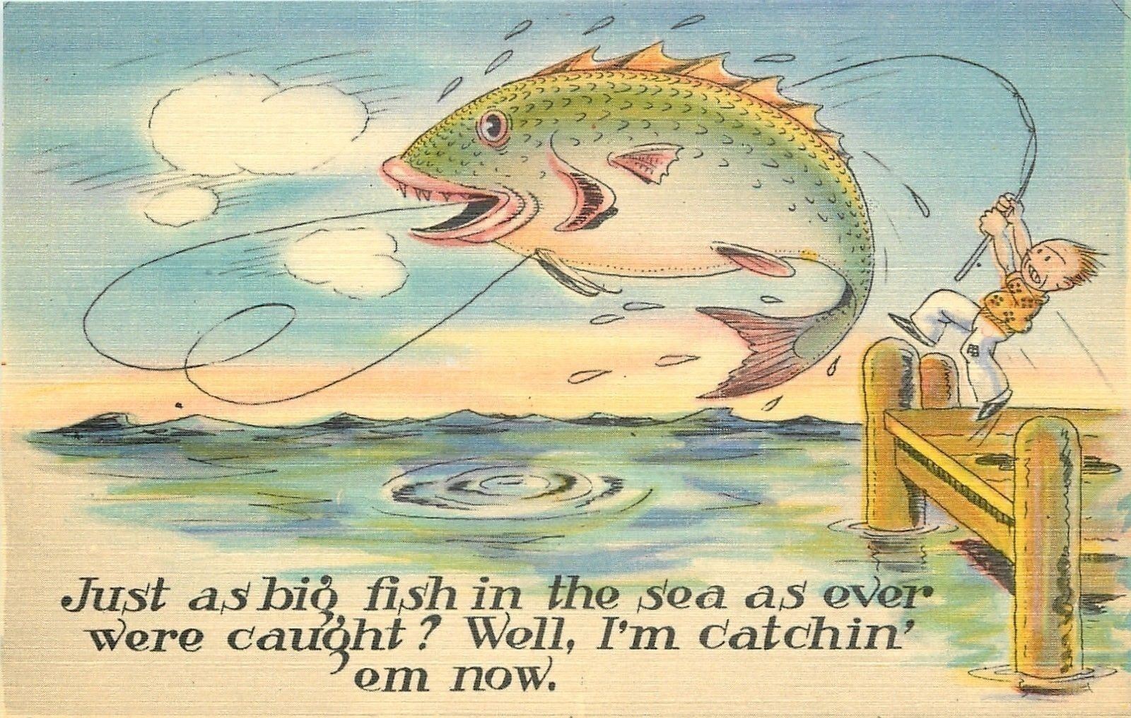 Comic~Exaggerated Fish Hooked~Big Fish in the Sea~1940s Linen Postcard