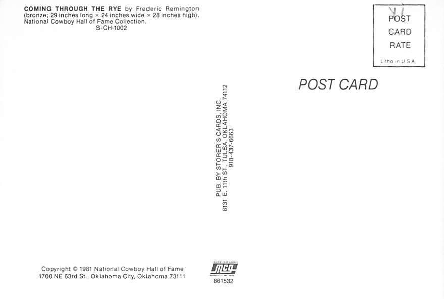 Coming Through The Rye, By Frederic Remington Postcard - View Images Grade: 1 Size: C - Continental Size Postcard - approximately 4 inch X 6 inch (15 CM X 10.5 CM) Grading Scale: Grade 1 = Perfect corners Grade ... Read More