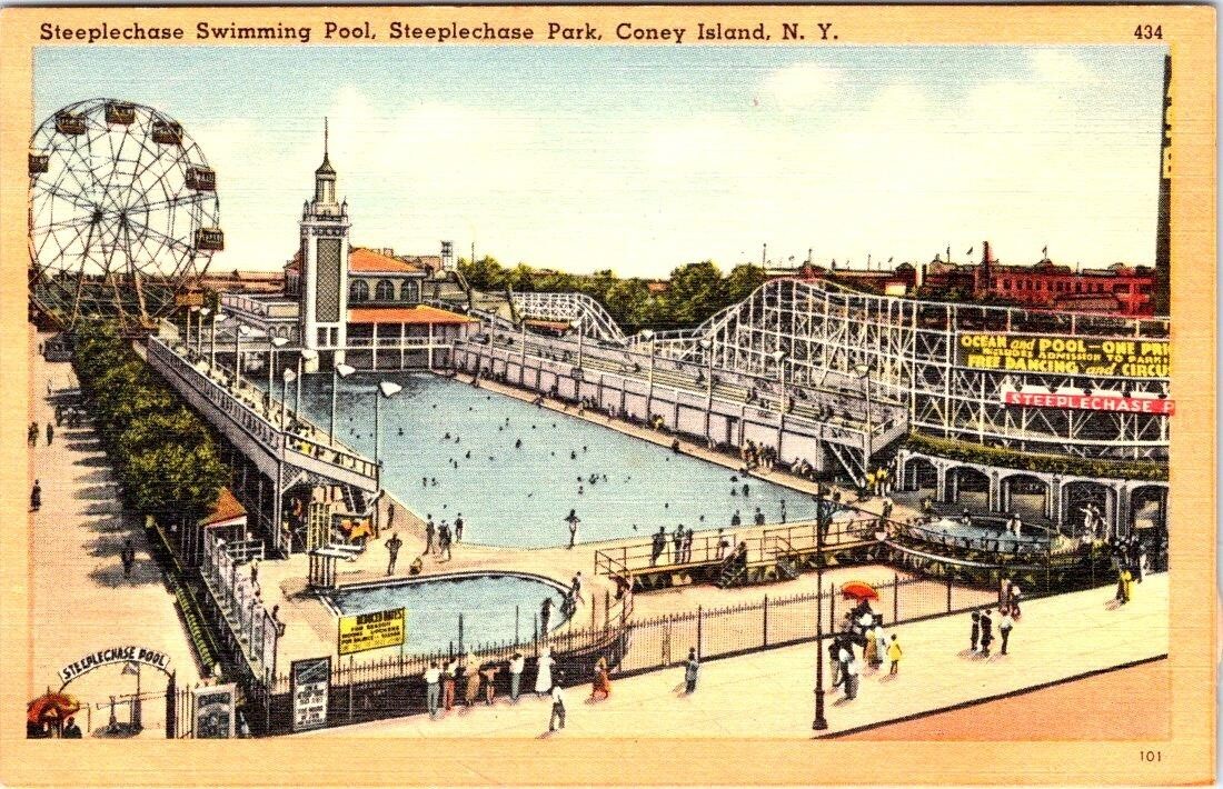 Coney Island, NY New York STEEPLECHASE AMUSEMENT PARK~SWIMMING POOL Postcard