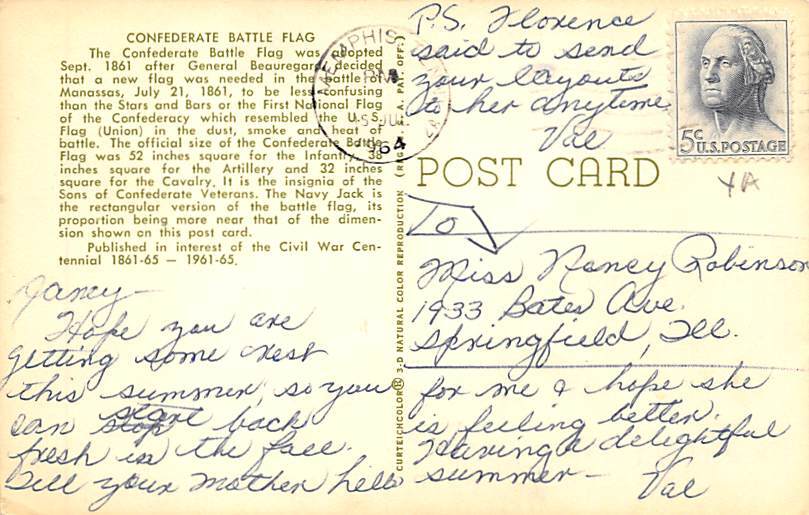 Confederate battle flag USA Civil War Postcard 1964, Grade: 1, , Size: Regular size: Approx 3 1/2 X 5 1/2 inch (9 cm X 14 cm) Grading Scale: Grade 1 = Perfect corners Grade 2 = Very Minimal corner wear, no cre ... Read More