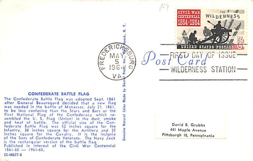 Confederate battle flag USA Civil War Postcard Postal Date: {{Product Field 4 ( Postal Used, Unused)}} Grade: 1 Size: Regular Size Postcard - approximately 3 1/2 inch x 5 1/2 inch (9 CM x 14 CM) Grading Scale: ... Read More