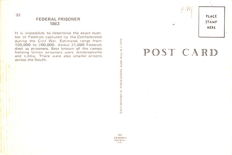 Confederate Prisoner - Grade: 1 Category: Modern Postcard, Continental Size, Approx 4 in x 6 in (10 cm x 15.25 cm) Product Size: Continental size: 4X6 inches (10.5 cm x 15 cm) Grading Scale: Grade 1 = Perfect c ... Read More