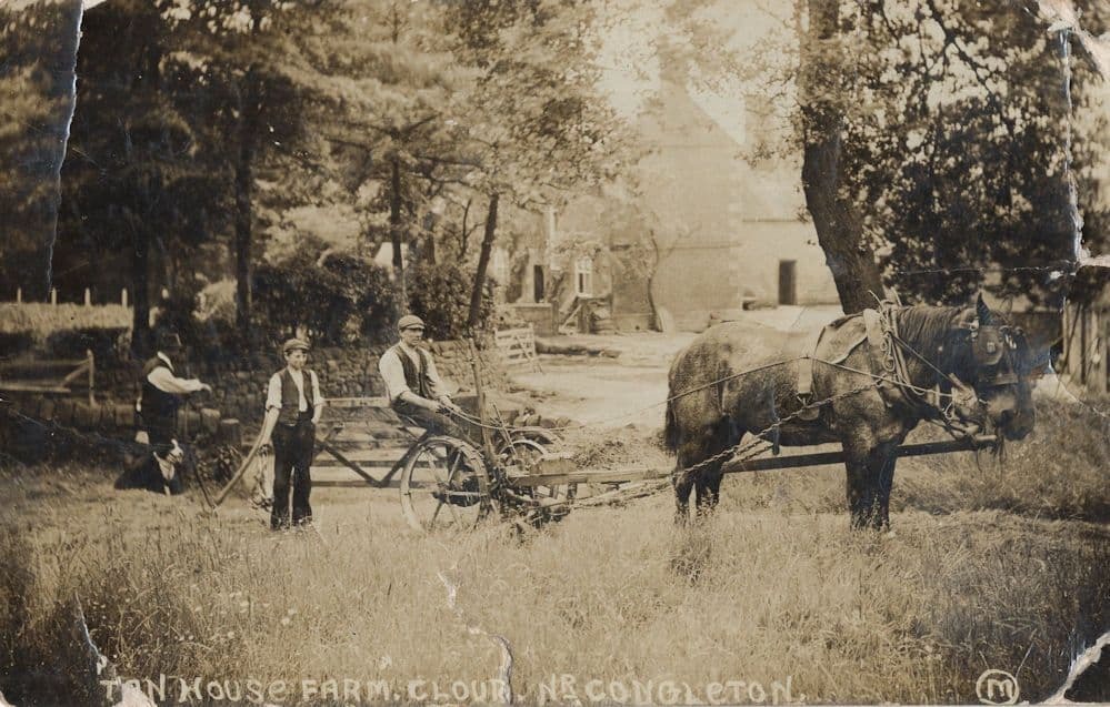 zx734 Antique postcard of this Congleton Farm - extremely worn - very strong creases - ageing - I struggle to grade even acceptable but a really rare postcard and it is real photo from the early 1900s showing the farmer and his staff too.