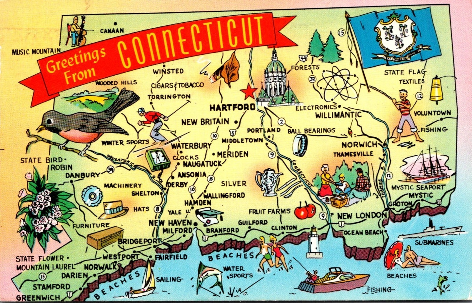 Connecticut Greetings With Map State Flower Bird and FLag 1964